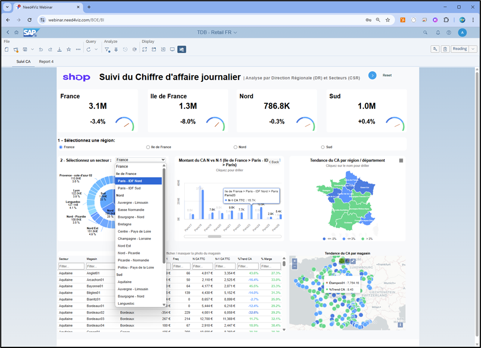 - Filtrage en temps réel par région, département, magasin