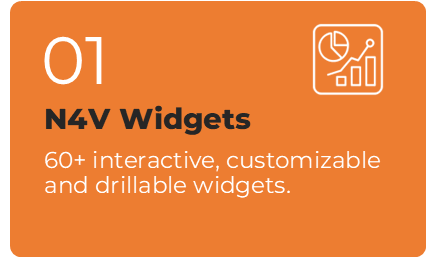 Enhance your reports with over 60 interactive, customizable, and drillable widgets. From drillbars to timelines, age pyramids, Gantt charts, and pivot tables, N4V Widgets offers a complete palette to create dynamic and engaging dashboards.