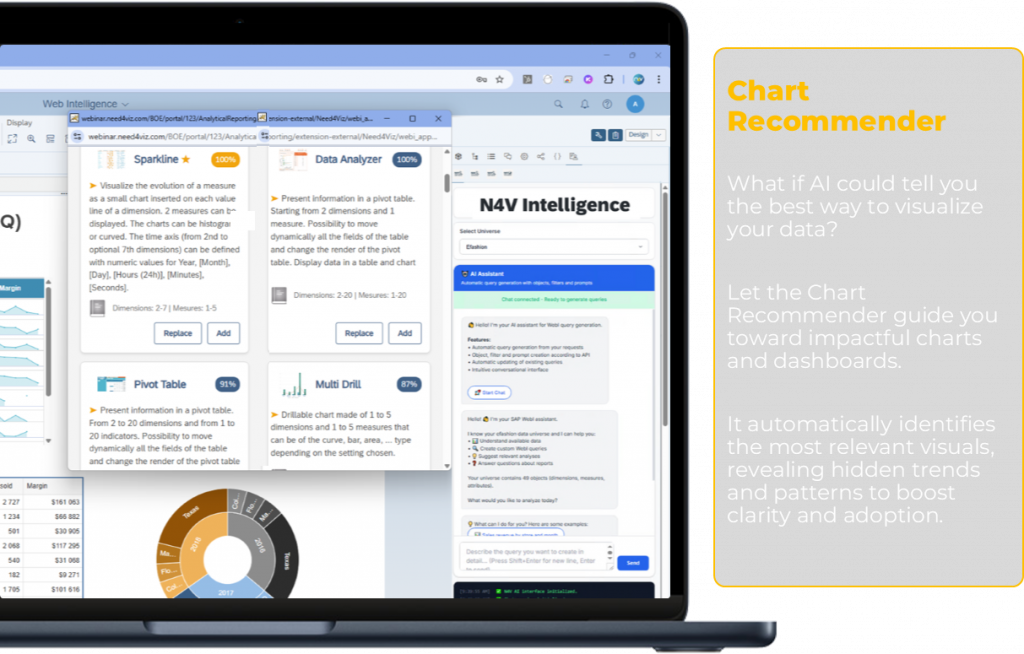 Using SAP BusinessObjects Web Intelligence and want to take it further? N4V FOR WEBI is the extension that revolutionizes your WebI experience by bringing interactivity, artificial intelligence, and simplified dashboard sharing.